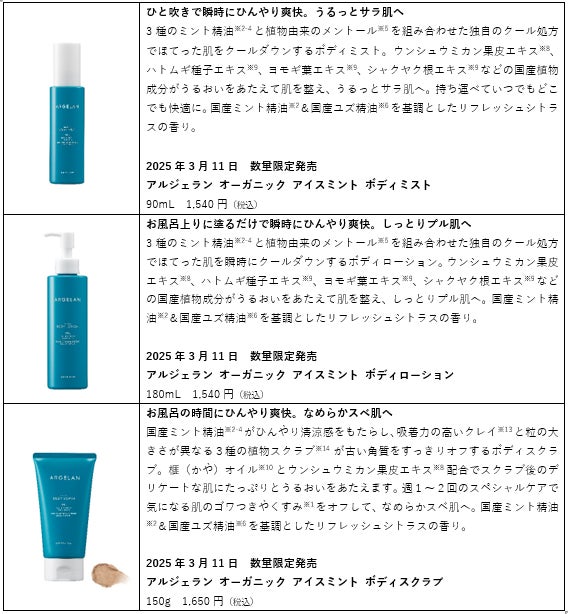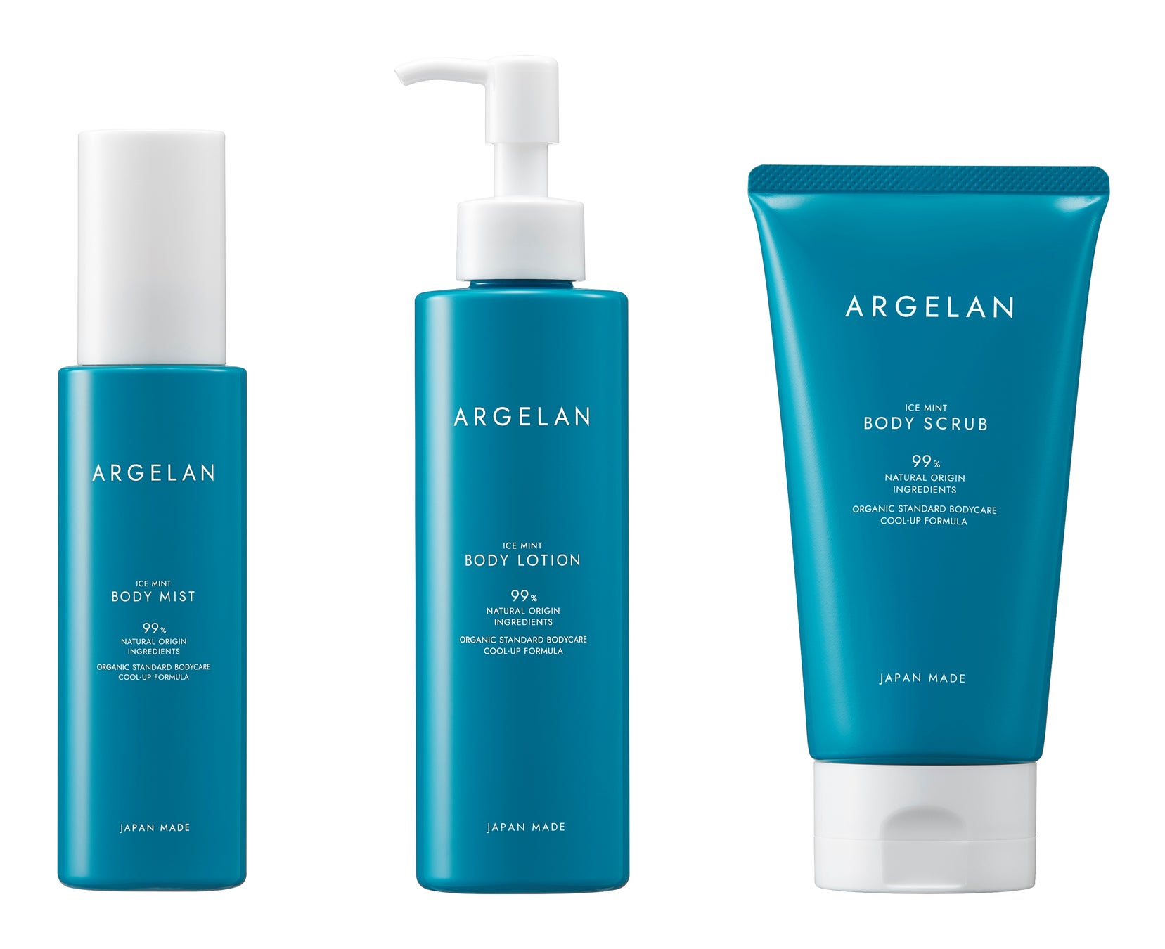 エビデンス&サステナブル オーガニックコスメとして2012年より、マツキヨココカラ&カンパニーのお客様にご好評をいただいているアルジェランから、毎年記録的な暑さを更新する日本の夏を乗り切るための冷感ボディケアアイテムが数量限定で登場します。ほてった肌をクールダウンする「ボディミスト」とお風呂上りのボディケアとして使える「ボディローション」、そして肌のゴワつきやくすみ※1をケアする「ボディスクラブ」の3アイテムをラインナップ。いずれも3種のミント精油※2-4と植物由来メントール※5配合でクールダウンしながら、厳選した植物エキスでうるおう肌へと導きます。
