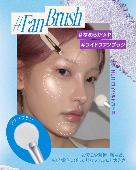 ハイライターパウダーを含ませ、頬、鼻など高く見せたいところにやさしくなじませ立体感を与えます。