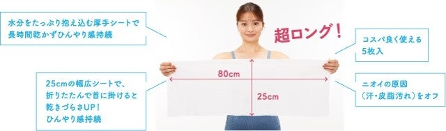 瞬間-4℃タッチ!ひんやりが90分間持続※1する極寒ロングタオル。フェイスタオル級の超大判ロングサイズで、首や頭に巻いて使えるシートです。ピュアシャボンの香り。ミョウバン配合※3