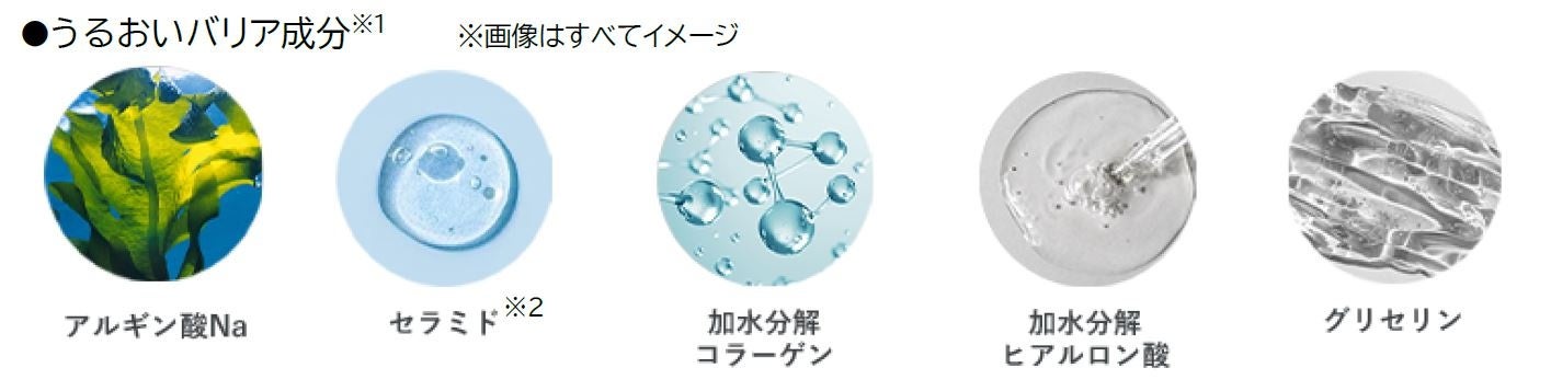 水分を抱え込み、肌を保湿する「アルギン酸Na」、角層バリアのうるおい保持に重要な役割を果たす「セラミド※2」、角層のすみずみまでうるおいを届ける「加水分解ヒアルロン酸」や「加水分解コラーゲン」、「グリセリン」で構成される「うるおいバリア成分※1」を配合。みずみずしく健やかな肌環境をキープします。