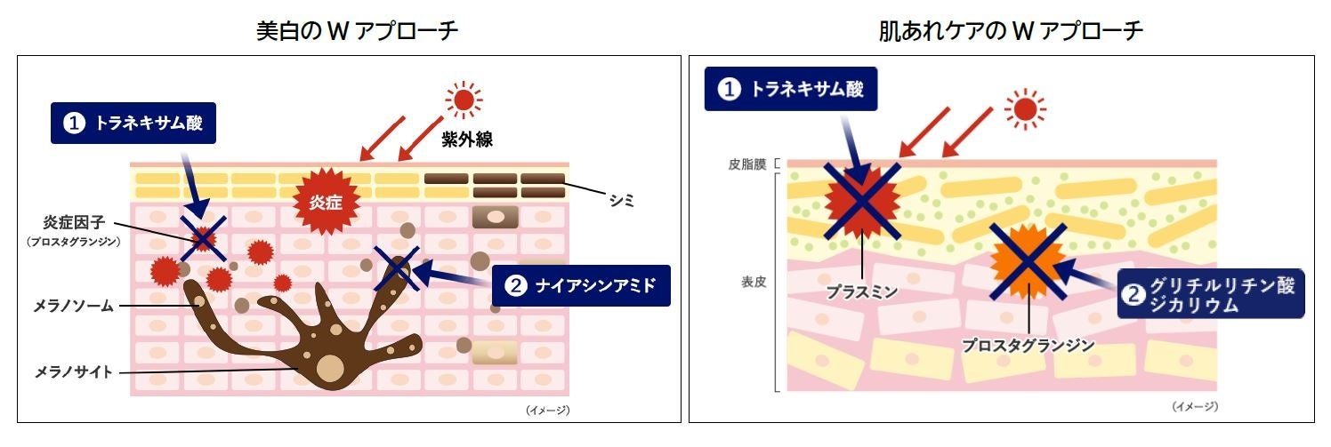 それぞれ2つの配合目的を持たせた有効成分「ナイアシンアミド(シワ改善・美白)」と「トラネキサム酸(美白・肌あれ防止)」に加え、「グリチルリチン酸ジカリウム(肌あれ防止)」を配合したことにより、美白と肌あれにはそれぞれ2つの有効成分でのWアプローチが実現しました(右図参照)。加齢により深刻になるシワや、透明感の低下、バリア機能の乱れによる肌あれなど、肌悩みが尽きない“おとな弱バリア肌”をトリプル有効成分で徹底ケア。1品でシワ改善・美白・肌あれまでケアします。