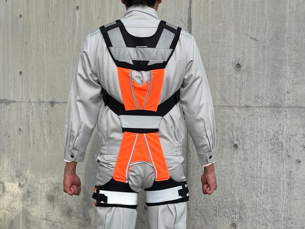 さらに、CES2024で紹介し大好評だったアシストスーツのデザイン性、装着性、利便性を向上させた製品を展示いたしました。こちらは空気圧人工筋肉によるアクティブな支援ができる、まるで衣服のように軽量柔軟なアシストスーツです。主に荷物の持ち上げ時に背中から腰にかけて筋肉を支援します。