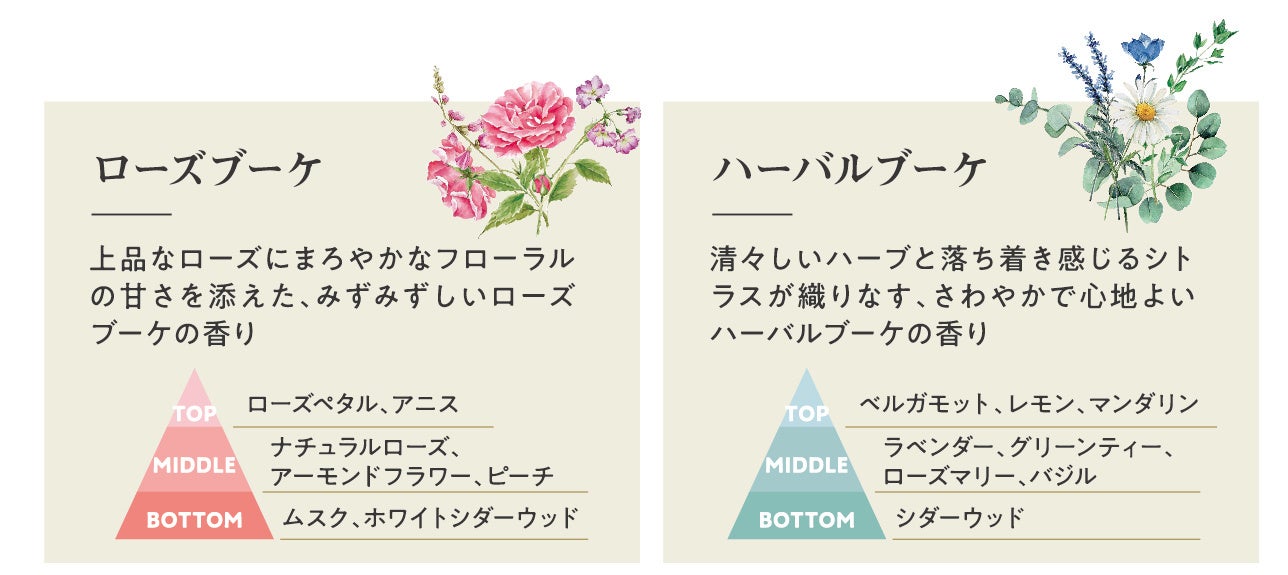 上品なローズにまろやかなフローラルの甘さを添えた、みずみずしいローズブーケの香り