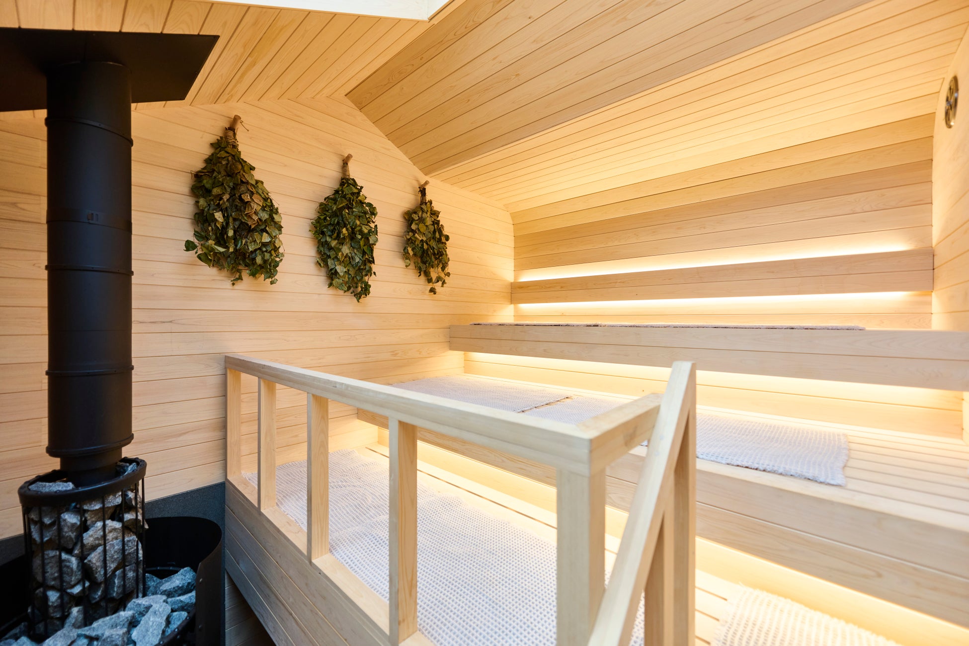サウナ室はサウナプロデューサー「ととのえ親方」こと松尾大氏が監修。大きめの薪ストーブを配置している為、本格的なセルフロウリュが楽しめる他、プライベートな専用ガーデンには富士山をモチーフにした水風呂と露天風呂も用意しています。サウナ室にいながら富士山を眺められる開放的な設計もリトリート時間にぴったりの幻想的空間です。