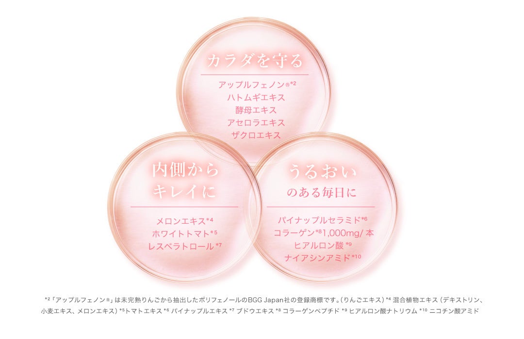 ポリフェノール豊富な「アップルフェノン®*²」に含まれる「りんご由来プロシアニジン」を1本に55mg配合し、体の美しさを守る美容ドリンク。さらに、メロンエキス*⁴、ホワイトトマト*⁵をはじめとした4種の植物エキス*12とヒアルロン酸*⁹を新たに配合し、パワーアップしてリニューアル。続けやすさにこだわった、美味しくさわやかなパイナップル風味。1本あたりコラーゲン*⁸1,000㎎配合。
