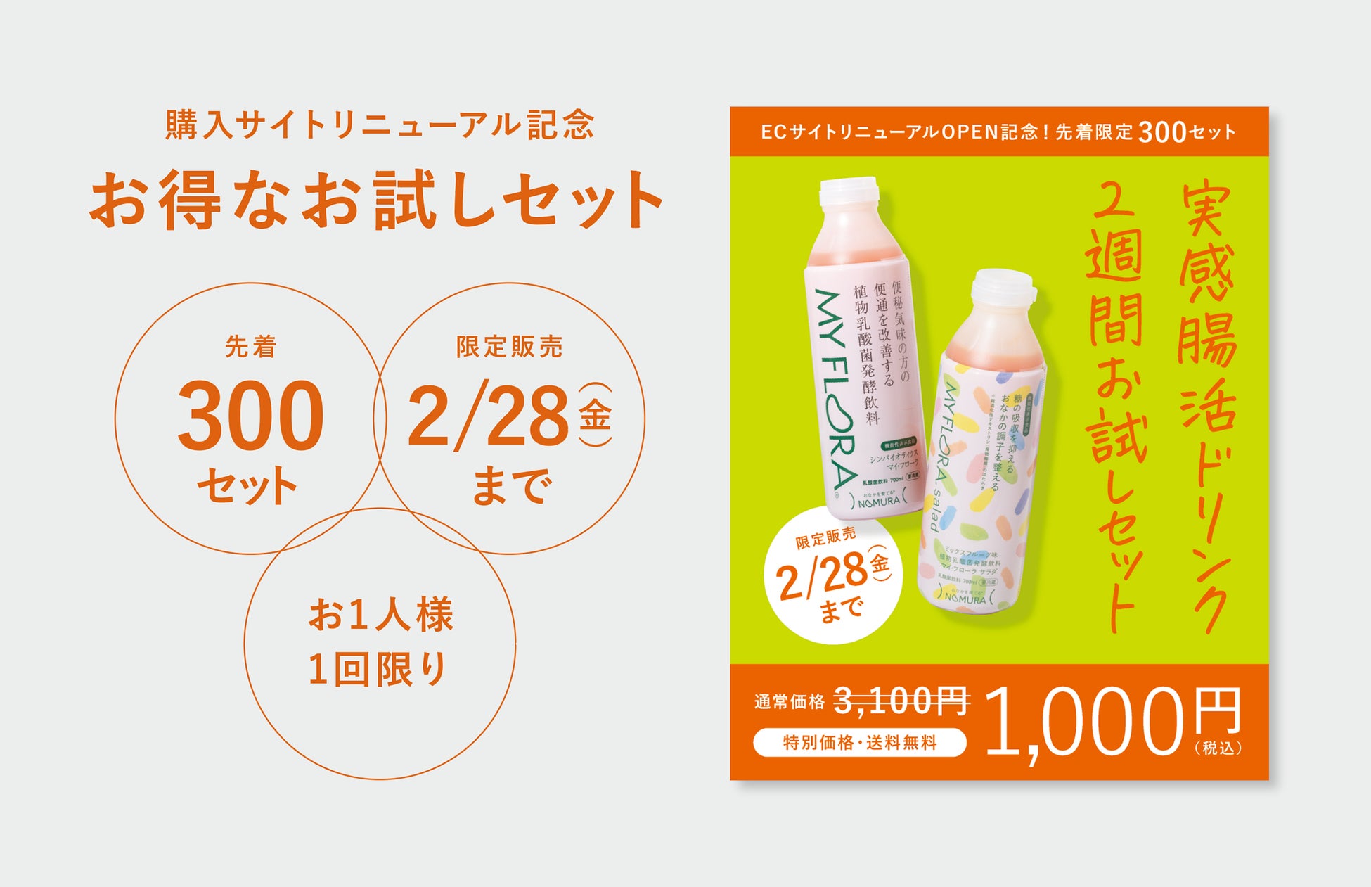 サイトリニューアルを記念し、『2週間お試しセット』を期間限定で特別価格1,000円(税込・送料無料)にてご提供いたします。実感腸活ドリンク「シンバイオティクス マイ・フローラ」「マイ・フローラ サラダ」2種を飲み比べていただけるセットです。ぜひ、味の違いやおなかの変化などを体感いただく機会としてご活用ください。(*〜2025年2月28日までの期間限定企画)