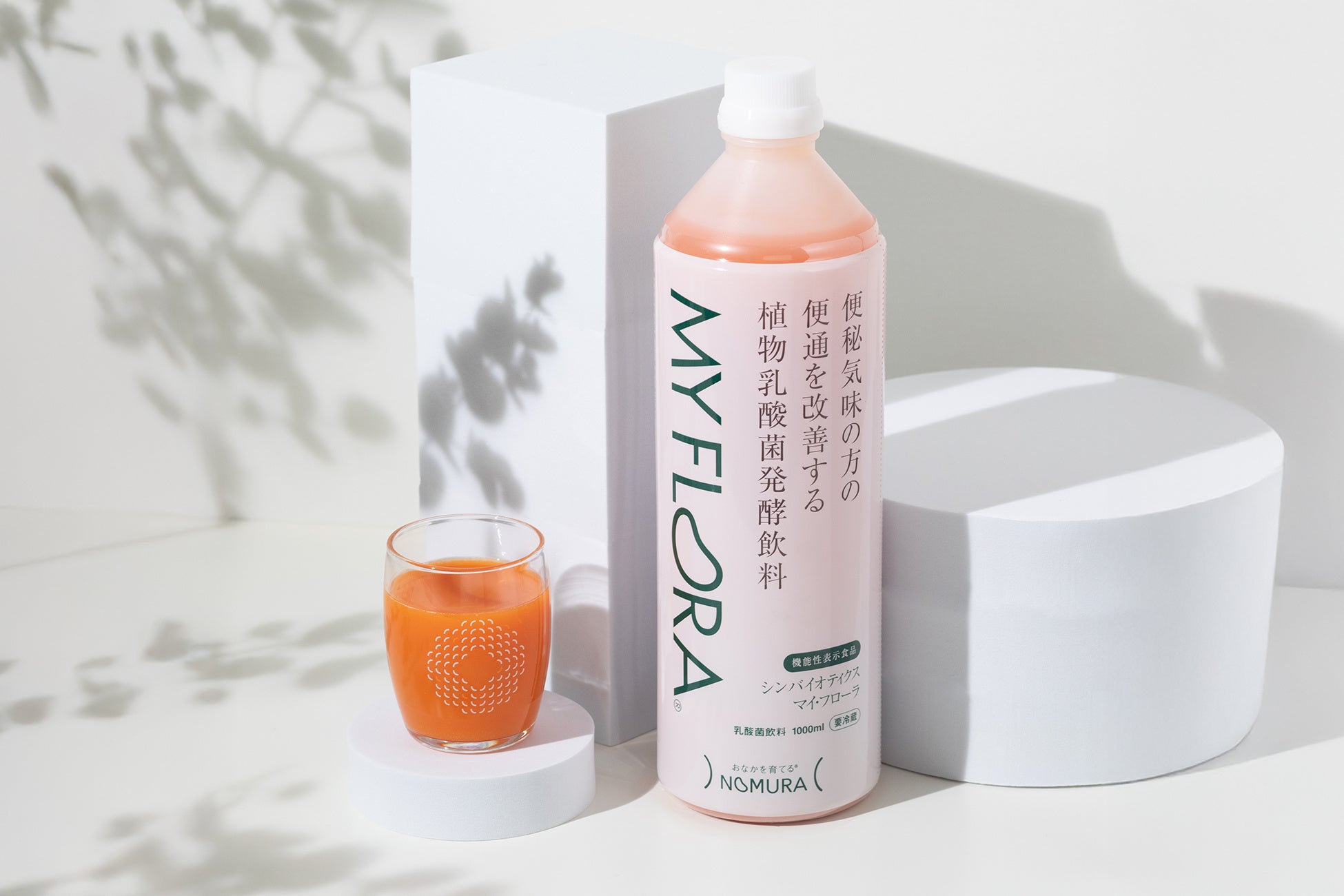 「シンバイオティクス マイ・フローラ」【機能性表示食品】は、「おなかを育てる」をコンセプトにしている野村乳業(1897年創業)が培ってきた独自の発酵技術を用い、広島大学との共同研究から生まれた新しい乳酸菌飲料です。一般的な乳酸菌飲料が牛乳を動物乳酸菌で発酵させているのに対し、「マイ・フローラ」は生命力の強い“植物乳酸菌”で野菜を発酵させています。にんじんの自然な甘さに乳酸菌が醸す酸味がマッチしたさわやかな味です。