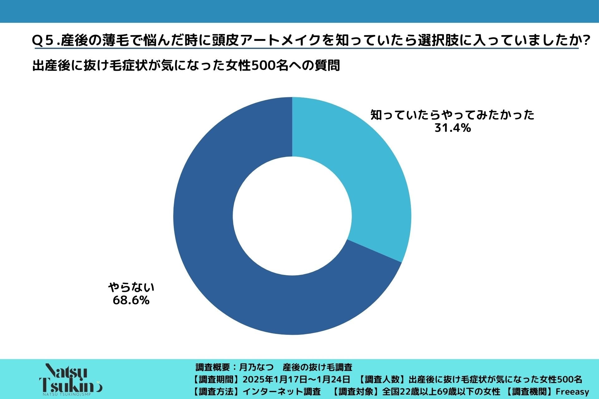 本調査で、産後の抜け毛への対処として、頭皮アートメイクを実施した女性は全体の約5%にとどまりましたが、「頭皮アートメイクを知っていたらやってみたかった」という回答が157名と全体の31.4%を占めました。この結果から、施術に対する潜在的な需要が高いことが分かります。