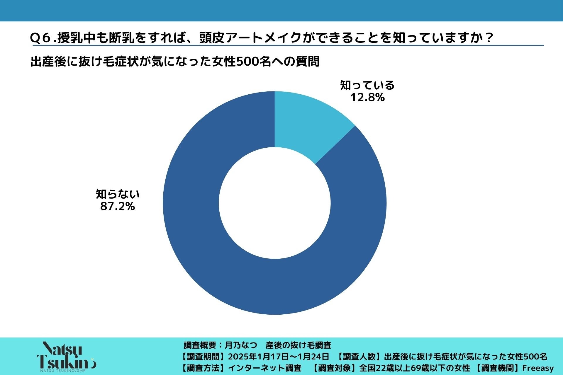 さらに、「授乳中も断乳をすれば頭皮アートメイクが可能である」ことについては、87.2%の女性が「知らない」と回答しました。この結果は、頭皮アートメイクのメリットや安全性に関する認知度が依然として低いことを示しており、情報提供が十分でない現状が浮き彫りとなりました。