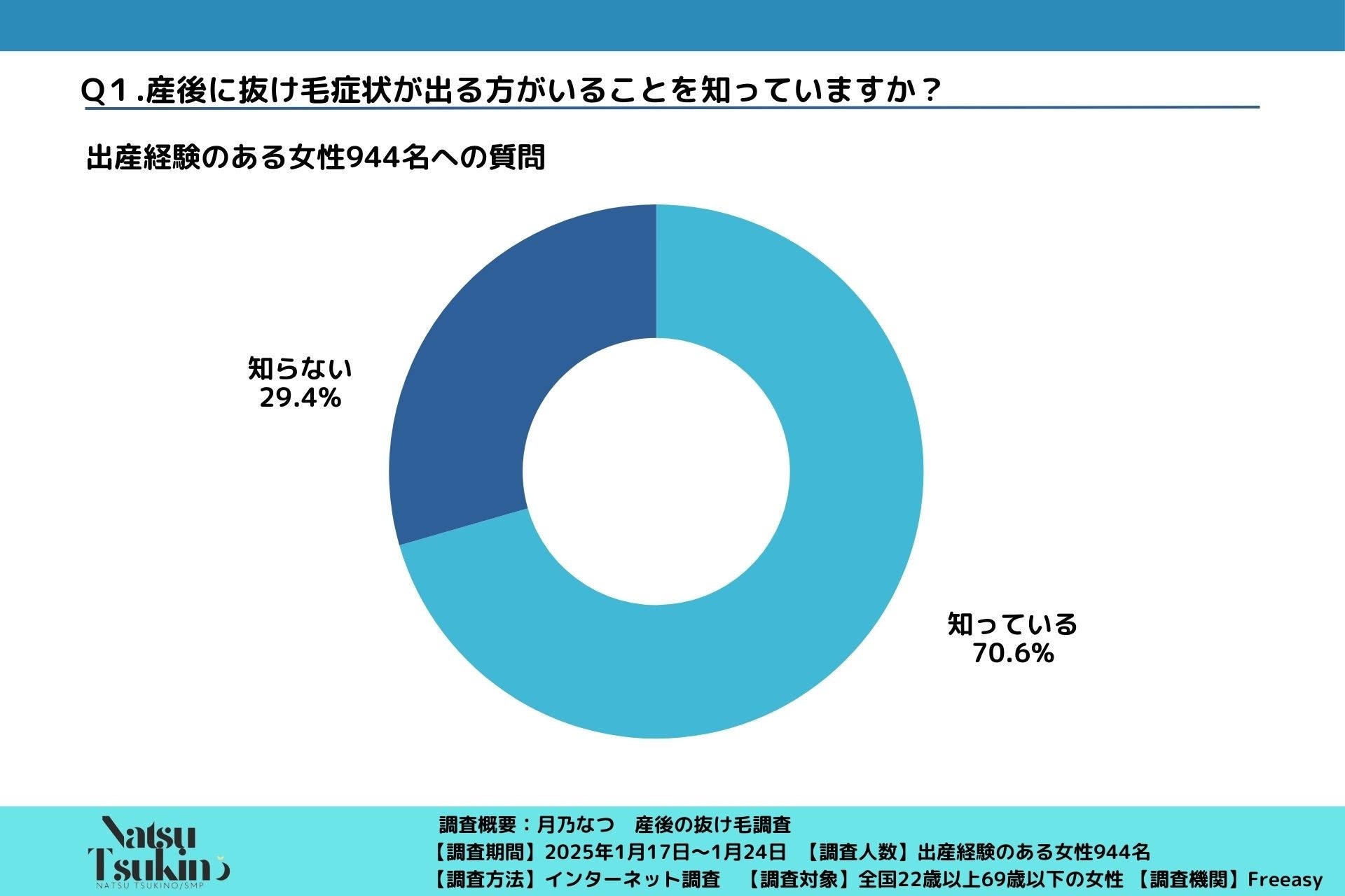 出産経験のある944名に「産後に抜け毛症状が出る方がいることを知っているか」を尋ねたところ、70.6%が“知っている”と回答しました。一方で29.4%は“知らない”と回答しており、産後の抜け毛に関する情報は、必ずしも全員に広がっているわけではないことが明らかになりました。