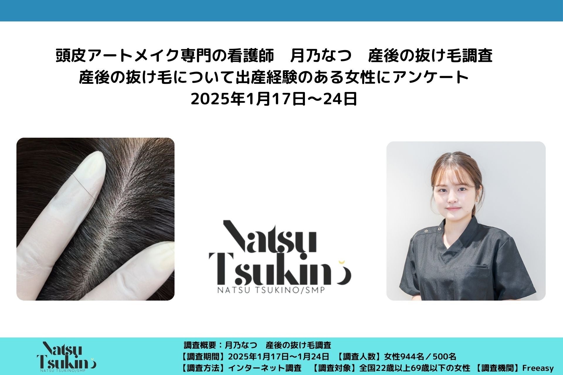 頭皮アートメイク専門の看護師 月乃なつ(以下、月乃)は、2025年1月17日から1月24日にかけて、全国の22歳以上69歳以下の出産経験のある女性を対象に「産後の抜け毛に関するアンケート」を実施しました。本調査は、産後の女性が抱える抜け毛の悩みに焦点を当て、改善に向けた新たな選択肢として、頭皮アートメイクの可能性を探ることを目的としています。