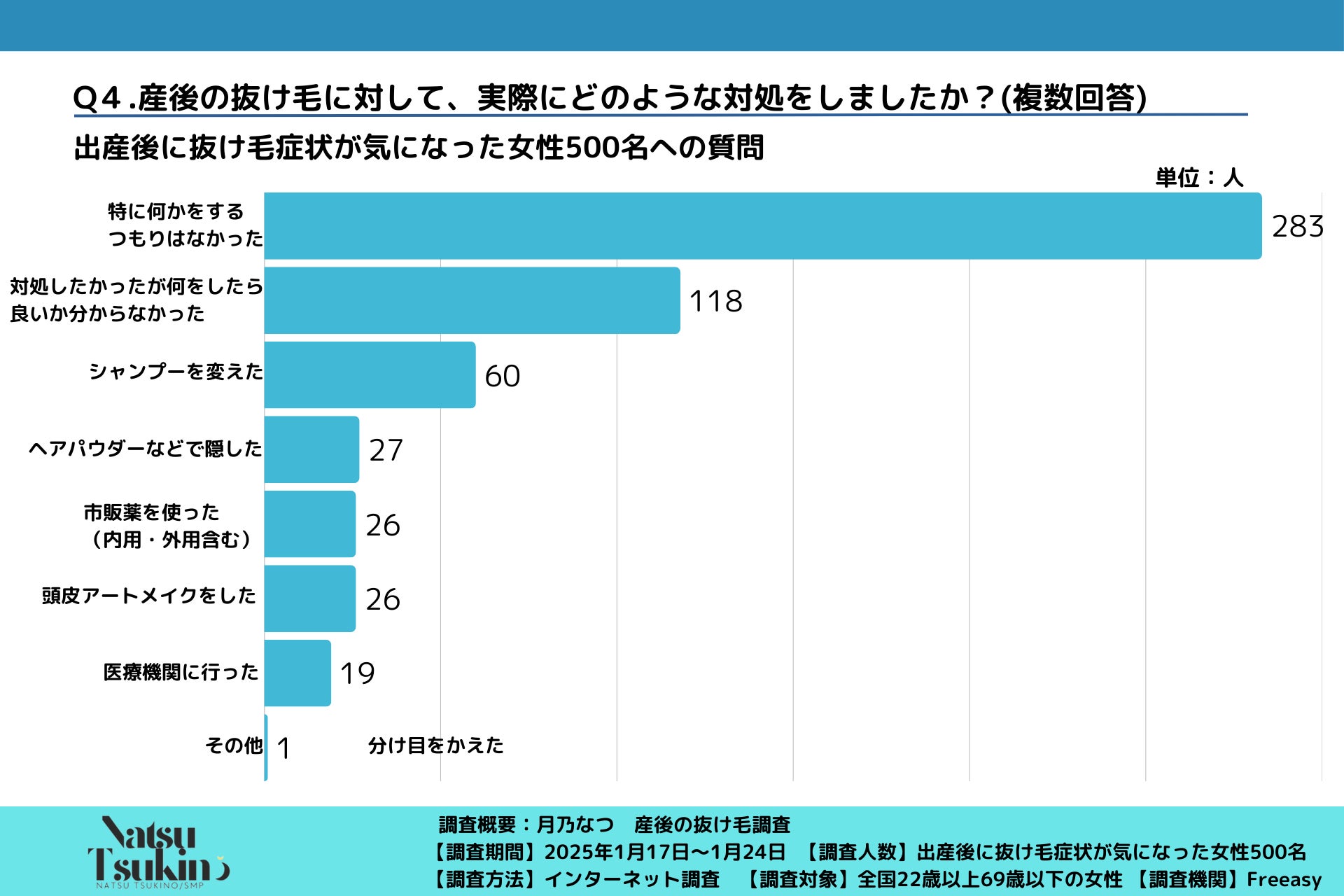 抜け毛に対する具体的な対処は、「シャンプーを変えた」が最も多く60名という結果でした。「ヘアパウダーで隠した」が27名、「市販薬を使用した」が26名、「頭皮アートメイクを施術した」が26名と、いずれも同程度の回答数となりました。「医療機関を受診した」という回答は、19名と最も少ない結果となっています。