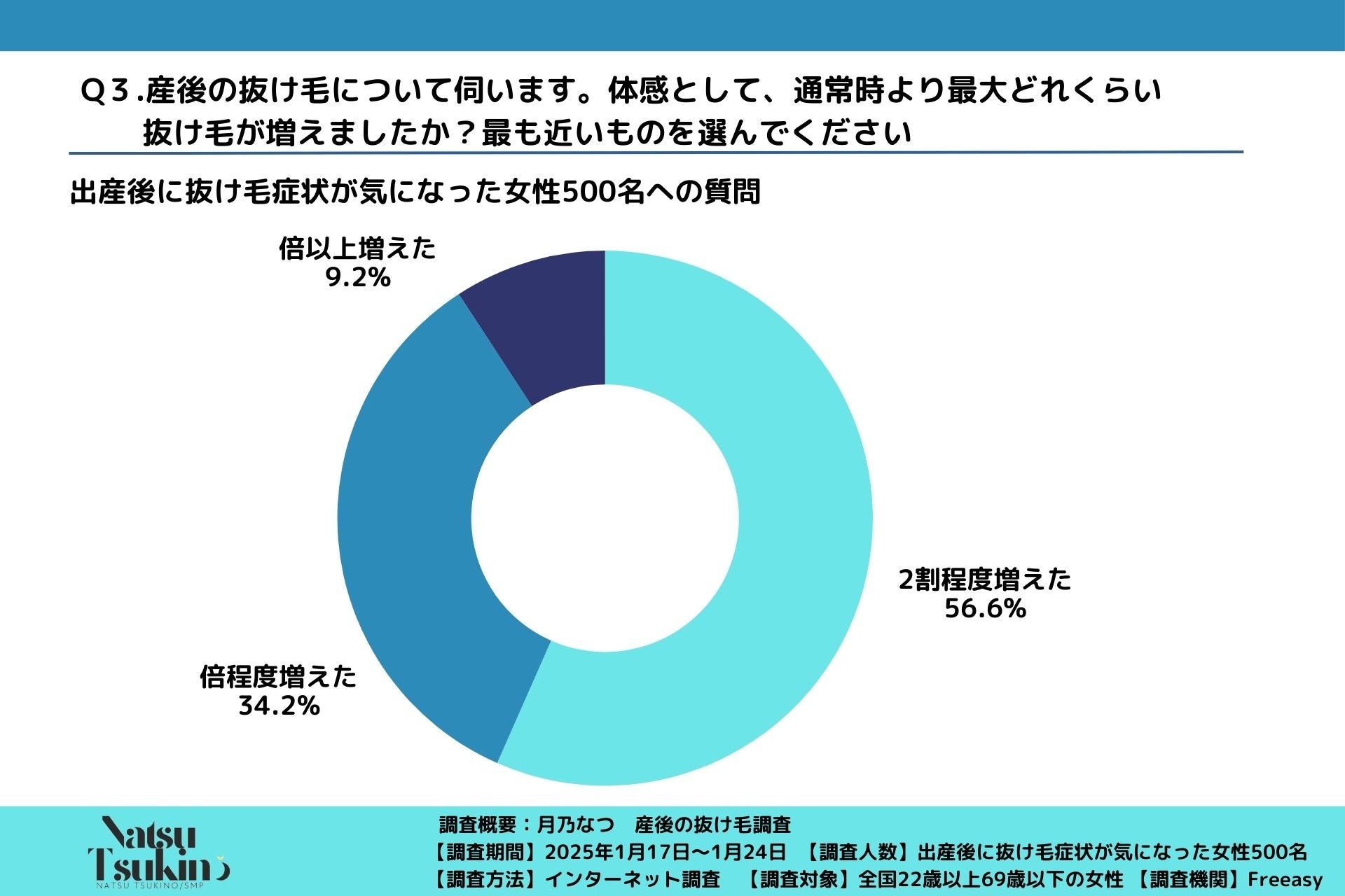 そこで、産後に抜け毛症状が気になったと回答した女性500名に対し、抜け毛の程度について調査したところ、「2割程度抜けた」と答えた人が全体の56.6%と最も多い結果となりました。「倍程度増えた」という回答が34.2%、「倍以上増えた」という回答が9.2%となり、約4割の女性が通常よりも大幅な抜け毛を経験していることが分かりました。
