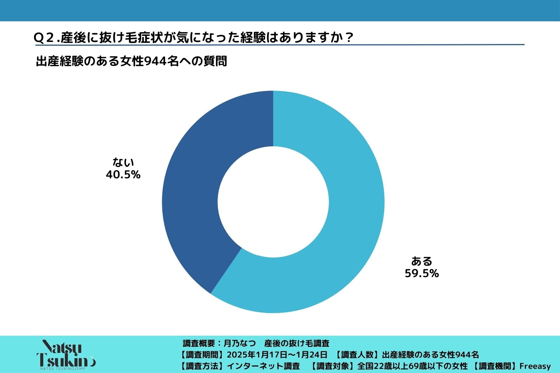また、実際に「産後に抜け毛症状が気になった経験があるか」と尋ねたところ、59.5%が「ある」と回答し、多くの女性が産後に抜け毛の悩みを抱える現状が明らかになりました。一方で40.5%が「ない」と回答しており、抜け毛の影響や感じ方には個人差が大きいことも分かりました。