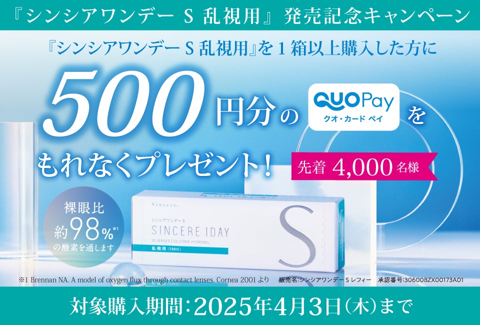 概 要 :対象店舗で『シンシアワンデー S 乱視用』を1箱以上購入した方、先着4,000名様に500円分のQUOカードPayをもれなくプレゼント!