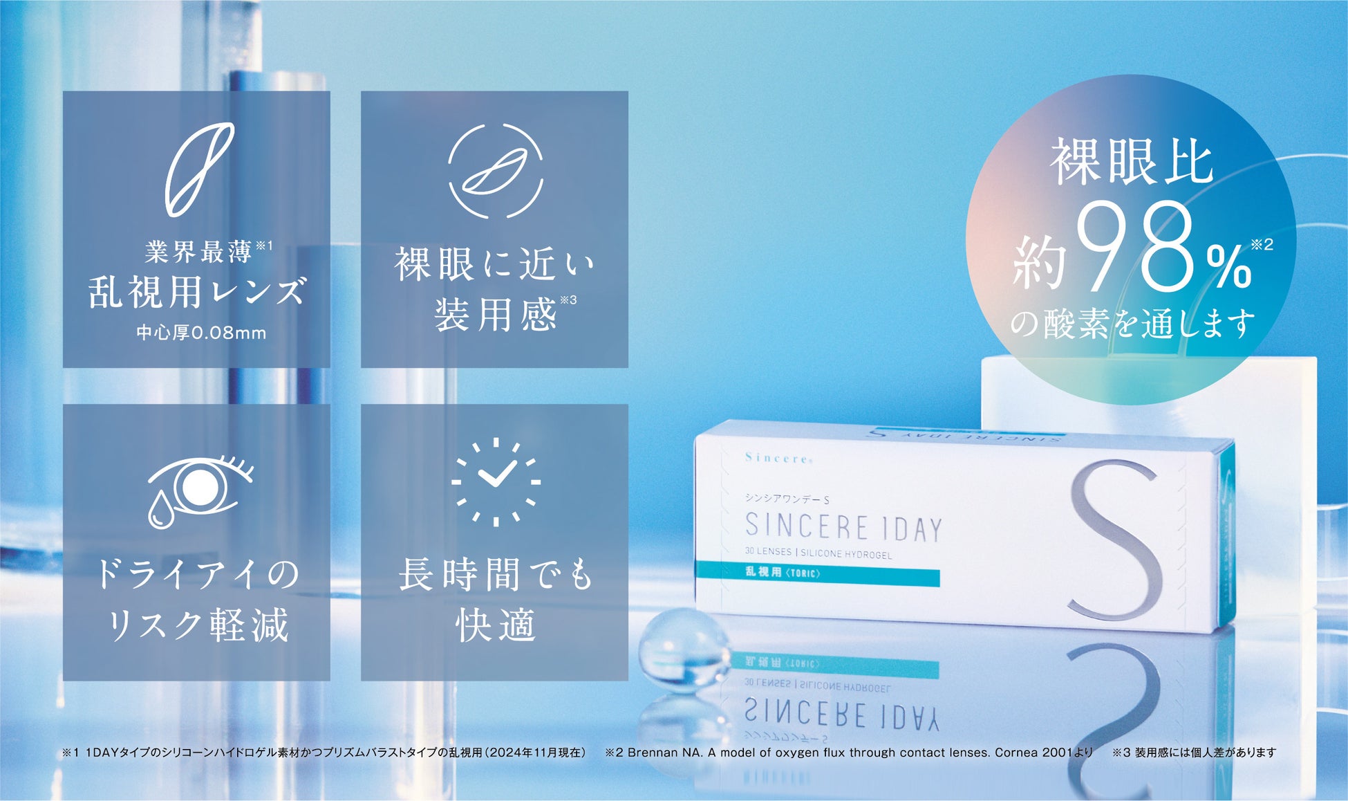新商品の『シンシアワンデー S 乱視用』は、酸素透過率の高さに加え、同タイプの乱視用レンズのなかでも業界最薄(※1)のレンズ設計を実現。既存商品の近視用レンズ『シンシアワンデー S』で好評な着け心地の良さと裸眼に近い自然な装用感を乱視用レンズでも目指して、長時間でも目が疲れにくい商品を開発いたしました。