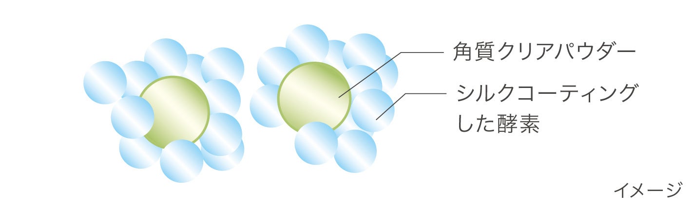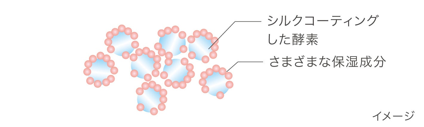 酵素は湿気や高温に弱く、高温多湿の環境下では本来の働きを発揮できなくなる。そのため、独自開発の絹処理技術を活かし、酵素をひとつひとつシルクでコーティング。水分や熱の影響を受けにくく、酵素の働きを安定化させる。