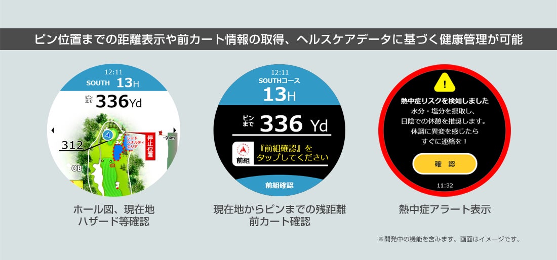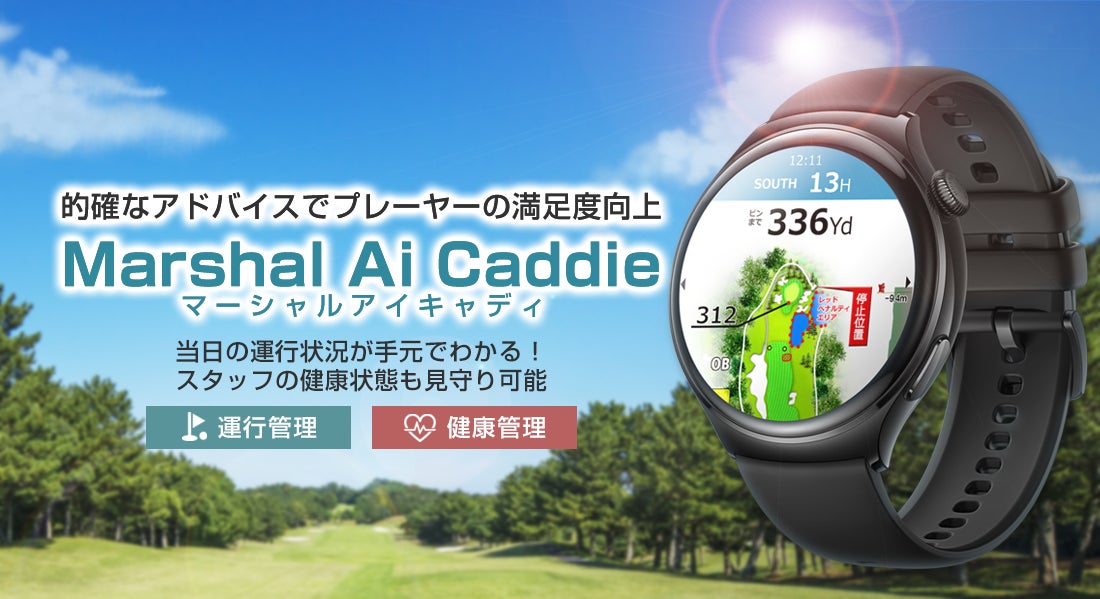 「Marshal Ai Caddie」はスマートウォッチを活用し、通常の距離案内に加え、前組との距離案内、カートナビ同様の運行管理機能、マスター室とのコミュニケーション、心拍数などのヘルスケアデータによる熱中症アラート機能を提供します。