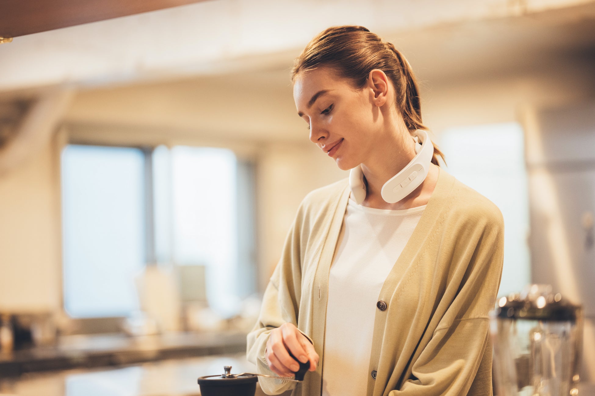 低周波×温感機能による首側面と後方ケアで血行を促進しコリや痛みを緩和する低周波治療器。首回りを囲むように6枚のパッドを配置することで、首後方のみのケアに比べ、より効果的に*コリや痛みを伴う部位をマッサージすることができます。*自社製品比