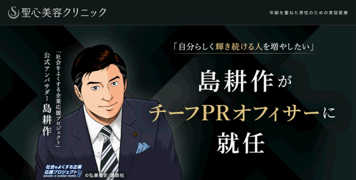 「とことん真面目に、美容医療。」をスローガンに、高品質な美容医療を提供する 聖心美容クリニック( 東京都港区他 全国11院、統括院長:鎌倉達郎)は、株式会社シンフィールド(東京都千代田区、代表取締役:谷口晋也)が発足し、島耕作が公式アンバサダーを務める「社会をよくする企業応援プロジェクト」に参画し、当院のチーフPRオフィサーとして、島耕作を起用しました。