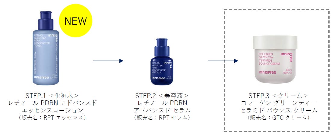 イニスフリーはこのような渡韓美容のニーズに着目し「自宅で簡単に渡韓美容クリニック発想のスキンケアを」という考えから新しい美容液を開発し、 2024年9月に『レチノール PDRN アドバンスド セラム』 (販売名:RTP セラム) を発売。さらに2025年3月には新しい化粧水『レチノール PDRN アドバンスド エッセンスローション』 (販売名:RTP エッセンス)が登場。スキンケアステップを強化することで、ますます肌悩みに応えるラインナップをご提案します。