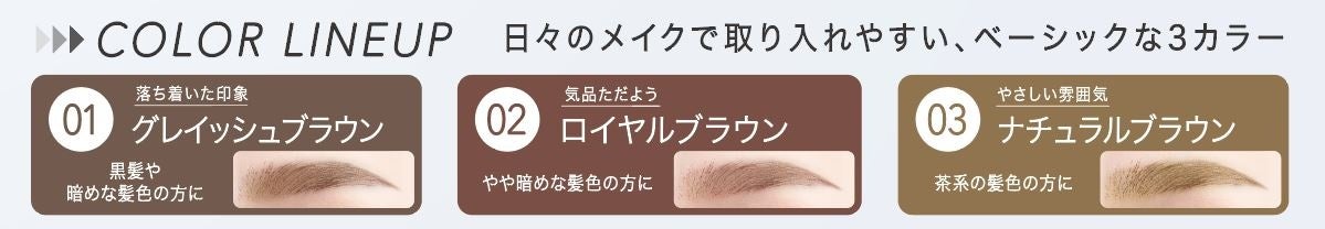 ラインアップは、日々のメイクで取り入れやすいベーシックな3カラー。髪色やなりたい雰囲気で選んでいただけます。仕上げに眉マスカラをのせるのもおすすめ。「カラーリングブロウマスカラ」との合わせ使いでさらに美しく立体感のあるリアル眉に仕上がります。