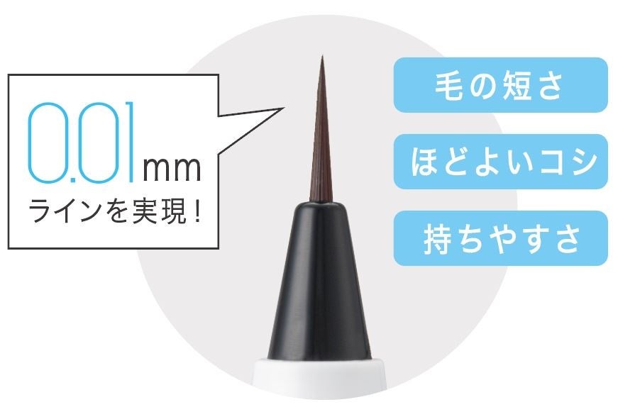 一番の特長は描きやすさ。厳選した2種の毛を混毛し、職人による手組で仕上げた筆を採用しました。また肌の表面を染め※1落ちにくさを発揮する、独自の染料処方を採用し、ラスティングと鮮明な発色を叶えます。
