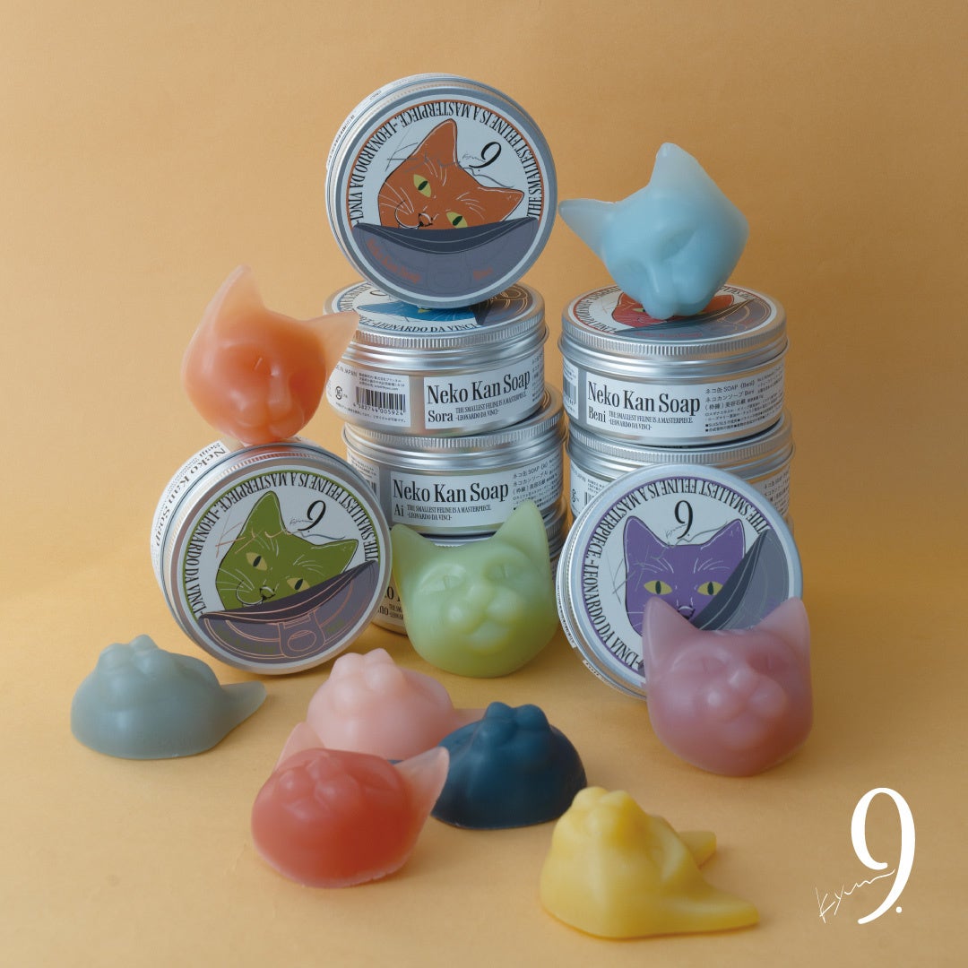 お肌のための自然由来成分を配合した石鹸に、9.kyuuオリジナル精油ブレンド「LANDSCAPE AROMA」で香り付け。成分や色、香り、キーワードから、直感で選んでもよし、数秘をルーツに選んでもたのしめるネコ石鹸です。