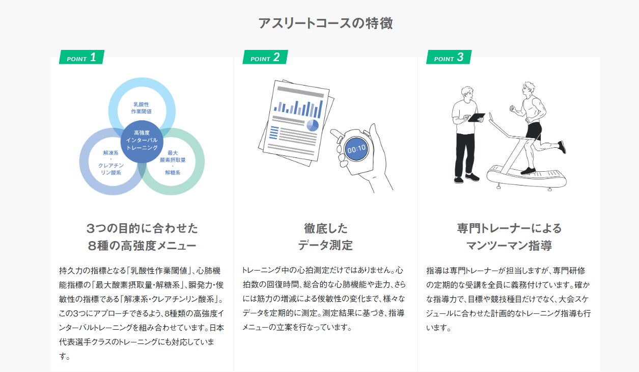 ハイアルチでは、数多くのトップアスリートへの指導実績に基づき、競技力向上に特化したアスリートコースをゼロから開発しています。高強度インターバルトレーニングを組み込んだ、完全マンツーマン指導です。