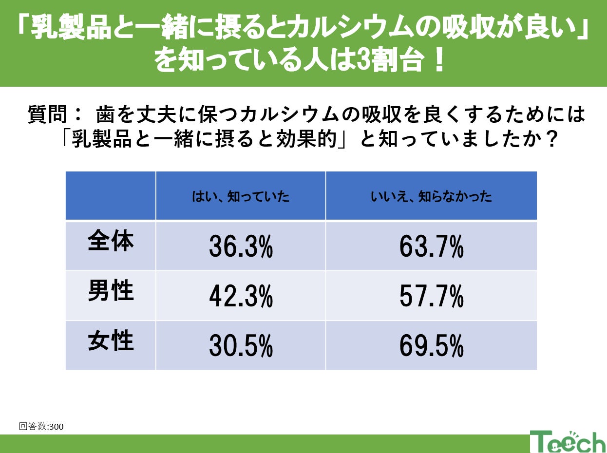 カルシウムは歯や骨を丈夫にするために重要な栄養素です。しかし、「乳製品と一緒に摂ることで吸収が良くなる」ことを知っている人は、全体の36.3%にとどまり、約6割以上の人が知らないという結果になりました。