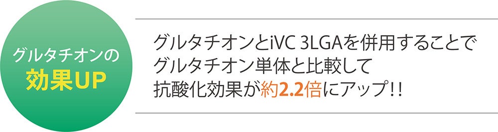 iVC 3LGAは、「グルタチオンブースター」として細胞内のグルタチオンの産生を促進(細胞内のグルタチオン産生量53%アップ)することで、細胞内の抗酸化力を向上し、酸化トラブルを肌の内側から抑制します。今回、弊社では新たに、iVC 3LGAが抗酸化物質として注目を集めるグルタチオンの抗酸化効果をブーストすることを確認しました。