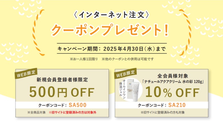 クーポンコード【 SA210 】のご入力で、ナチュールアクアクリーム 水の彩120gを10%OFFにて購入いただけます。