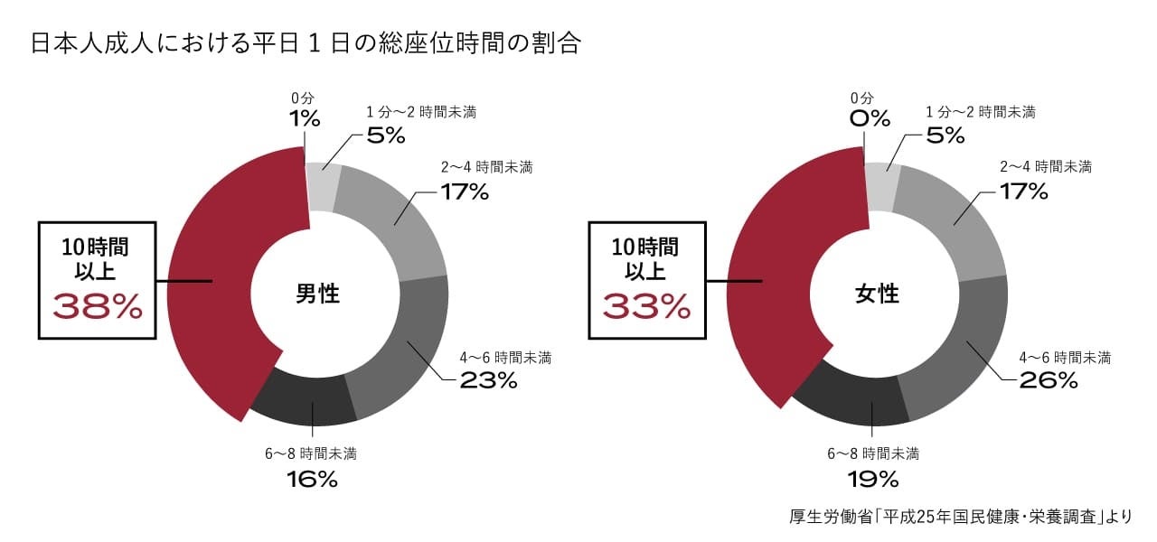 疲労とは、精神的・身体的に過度な負荷、つまりストレスがかかることで活動能力が低下してしまう状態を指します。※1 また、過度な運動だけでなく、長時間同じ姿勢でいることも疲労の原因となります。現代社会においては、長時間のスマートフォン使用や、デスクワークが中心の仕事、またコロナ禍以降の在宅勤務などにより、同じ姿勢で居る時間が長くなっていることが考えられます。厚生労働省の調査によると、平日の総座位時間が8時間以上であると回答した人は、30%を超えています。※2 長時間同じ姿勢で座り続けることは、特定の筋肉の使いすぎによる首コリ・肩コリなど、疲労の原因となり、血流も悪くなります。
