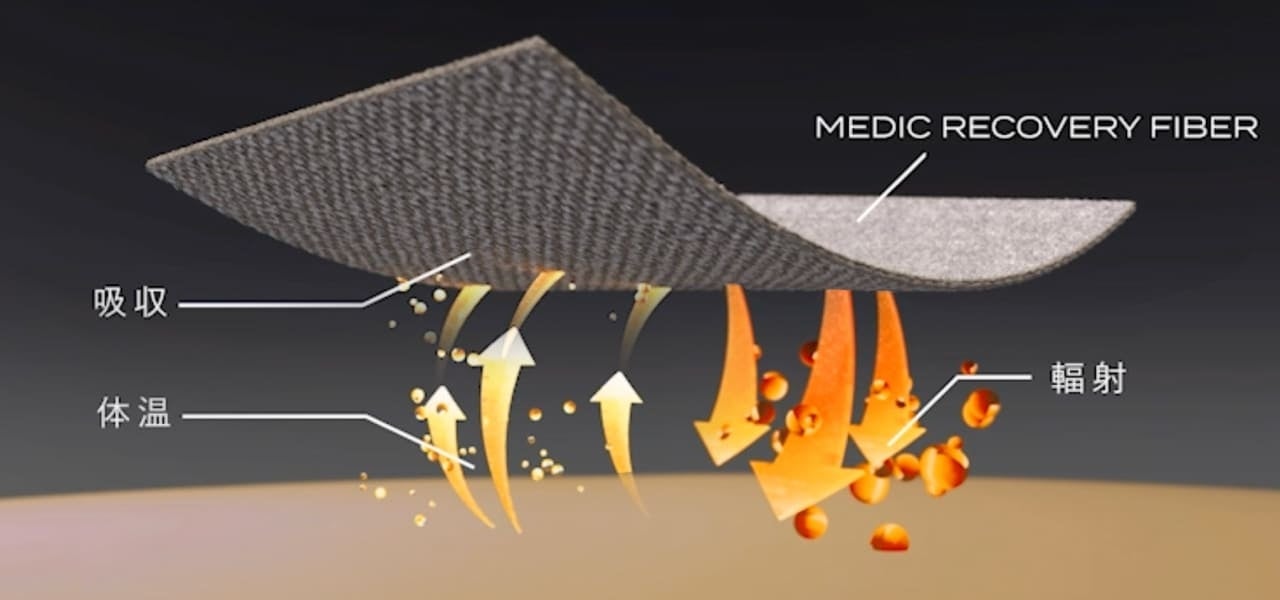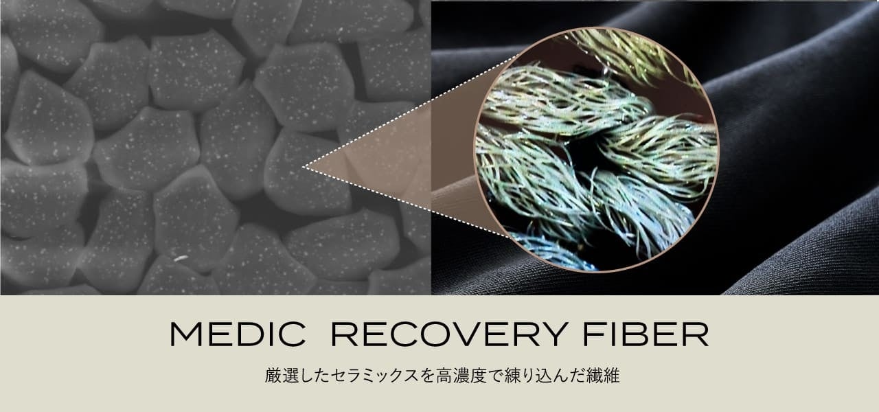 天然鉱物を原料とするセラミックス。その中でも純度の高い厳選したセラミックスを数種類ブレンドし、繊維に高濃度に練り込んだ「MEDIC RECOVERY FIBER」を独自開発。さらに、特殊な糸形状により体温の吸収と遠赤外線放射を高めることで、効果的に体を温め、血行を促進しやすくし、高いリカバリー効果を実現しました。