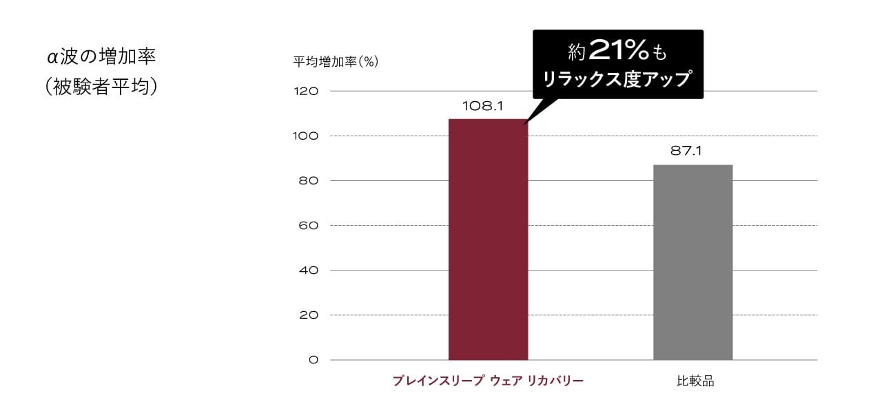 現代のストレス社会の中で、リラックスしてストレスを緩和することも大切です。リラックス度を測る脳波測定では、リラックス状態で観測されるα波の増加率が比較品と比べて、約21%向上しました。