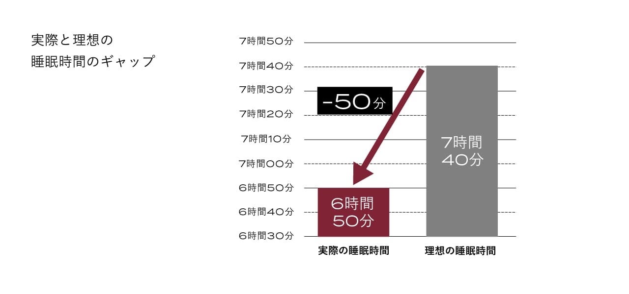 睡眠の大きな役割の1つは、日中に溜まった疲労の回復です。日本人の睡眠時間は依然として短く、ブレインスリープが実施した調査では、実際の睡眠時間は理想の睡眠時間より50分短いことが分かっています。※3 日本人には、限られた時間であっても質の高い睡眠を取ることが重要となります。睡眠時間を効率よく使って疲労を回復させ、回復効率を向上するプロダクトとして「ウェア リカバリー」を開発いたしました。