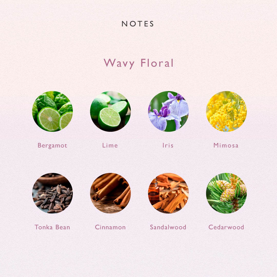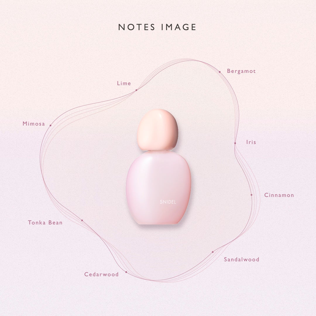 パウダリーで爽やかなアイリス、穏やかで柔らかなミモザ、甘さを秘めたベルガモッド、みずみずしく弾けるライム、甘くクリーミィなトンカビーンズ、スパイシーなシナモン、そして穏やかに鎮める香りサンダルウッド とシダーウッド。