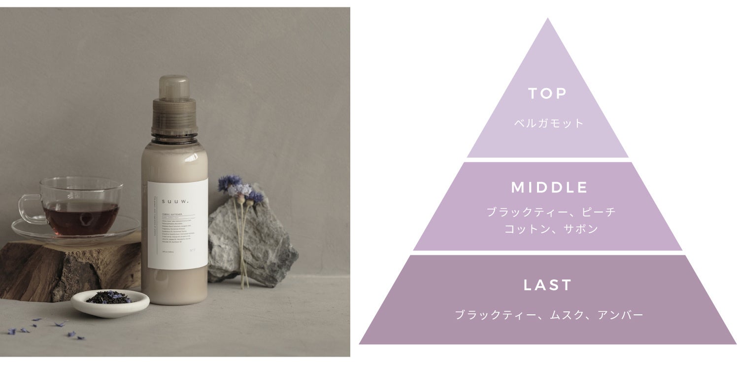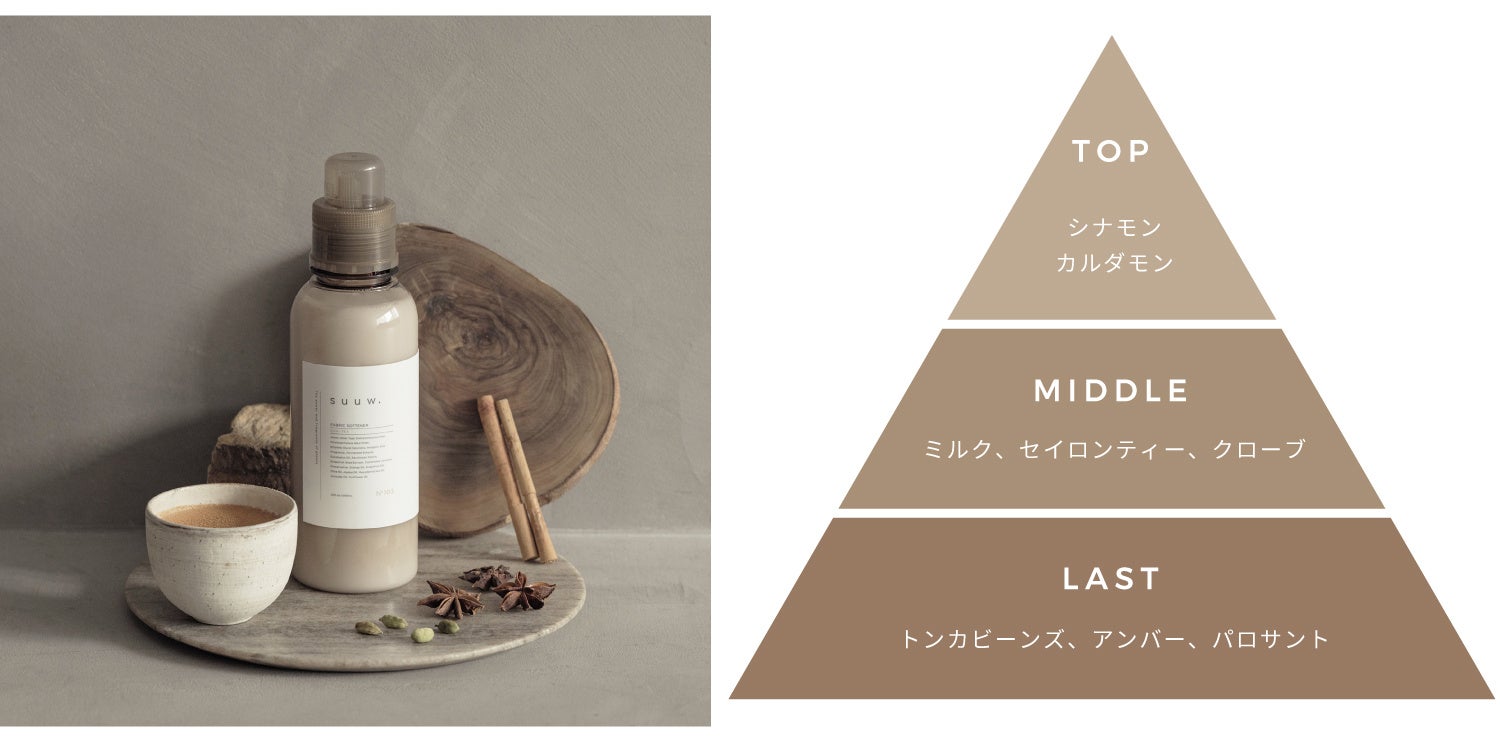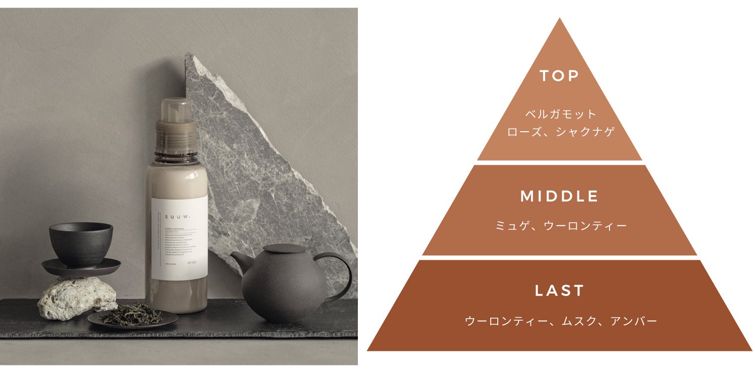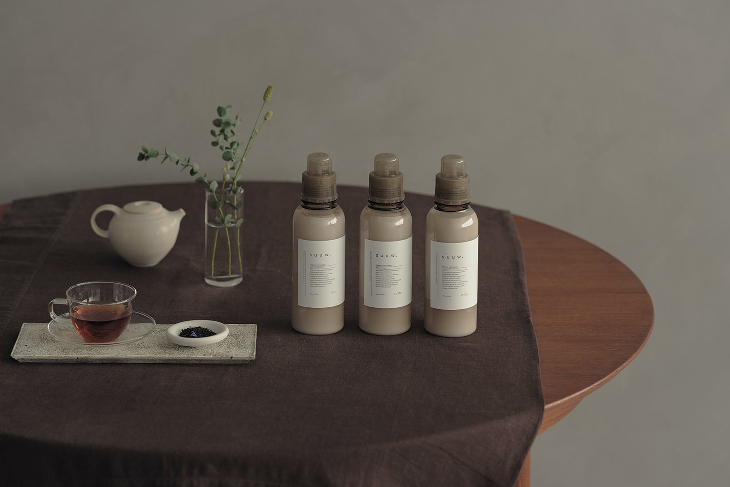 ティータイムから着想を得た「ティーシリーズ」がsuuw.のフレグランスに加わります。新たに登場したのは「アールグレイティー」「ウーロンティー」「チャイティー」の3種類。「アールグレイ」は定番の香りとして柔軟剤とハンドソープで、「ウーロンティー」「チャイティー」は季節限定の香りとして柔軟剤で展開いたします。構想から約3年を費やし、それぞれ個性が異なる”ティー”を再現。suuw.製品の特徴でもある、洗練された香りとやさしい香り立ちをご体感いただけます。