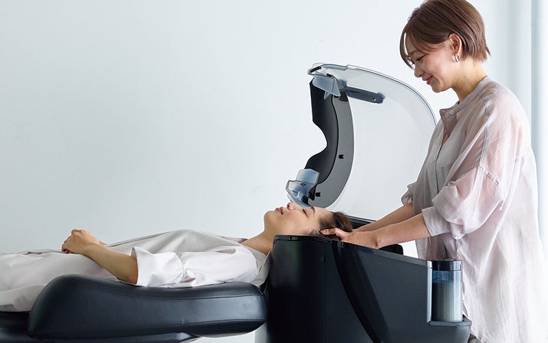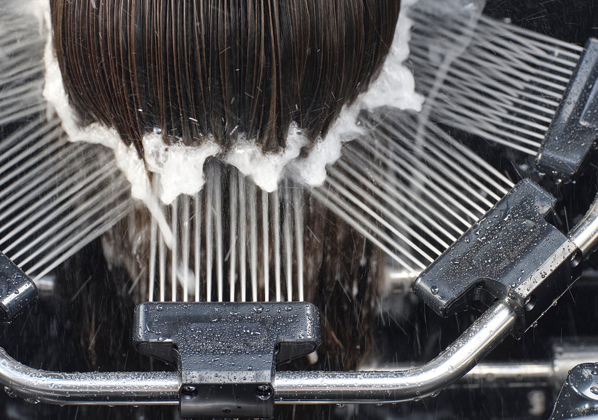 水流の力で頭皮や髪の汚れを洗い流す自動シャンプー機器。リズミカルな水流で爽快に洗い上げます。