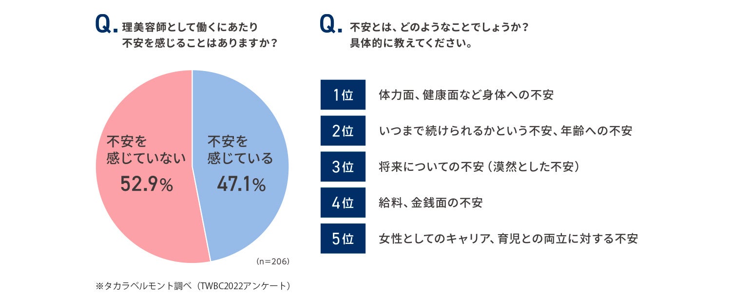理美容業界では、スタッフの早期離職や求人難などによる慢性的な人材不足が問題となっており、4割以上の方が初めて就職したサロンから3年以内に離職しているという調査データ※もあります。また、現役の理美容師の約半数が将来に不安を感じており、特に体力面や健康面に関する不安が最も多く挙げられています。