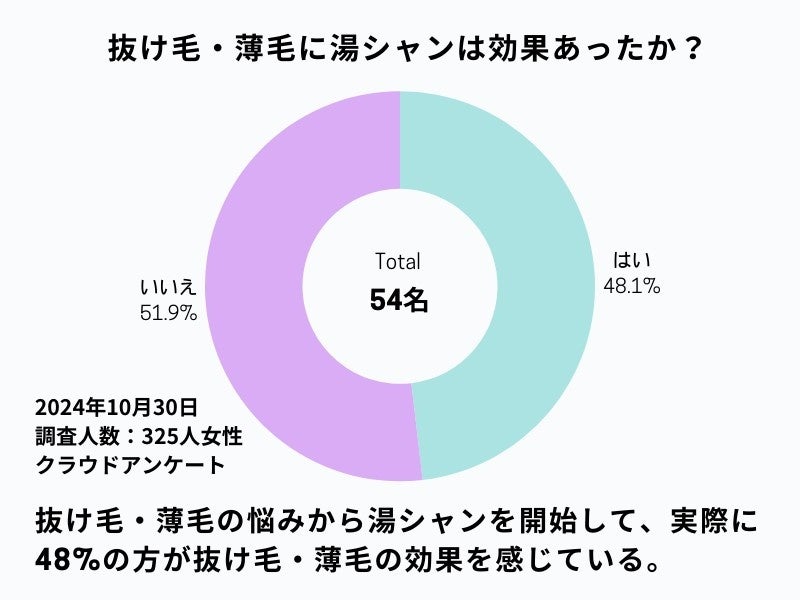 その中でも、約半数の方が効果を実感したという結果になったのが「抜け毛・薄毛」に悩む女性の湯シャンによる効果でした。