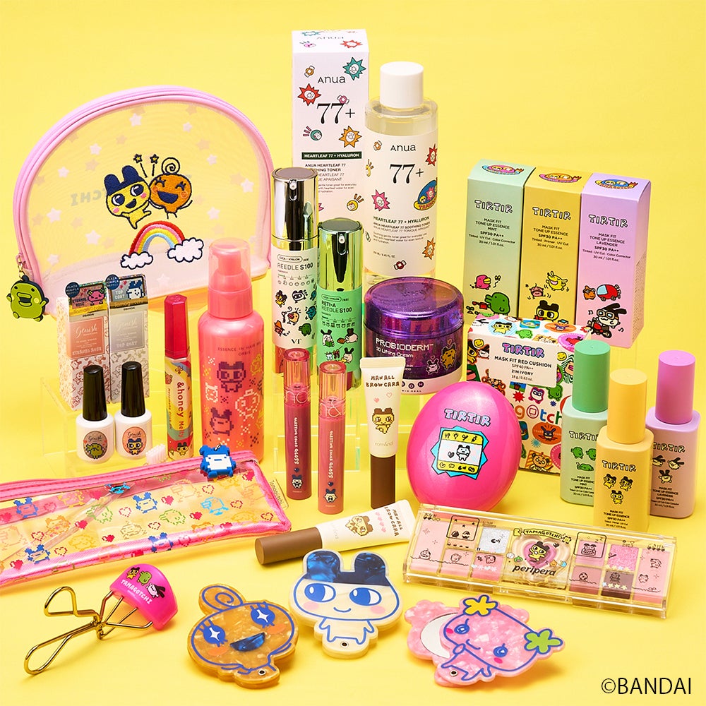 注目の「TIRTIR マスクフィット レッドクッション」はコンパクトの楕円型を活かして、まるでたまごっち本体のようなデザインに大変身!「rom&nd」の人気リップやアイブロウマスカラ、「peripera」のアイシャドウパレットもかわいらしいたまごっちデザインでお目見えします。そのほか話題のスキンケアアイテムや、ヘアケア、ネイルアイテムの人気アイテムまで、たくさんのたまごっちコスメが勢ぞろい!