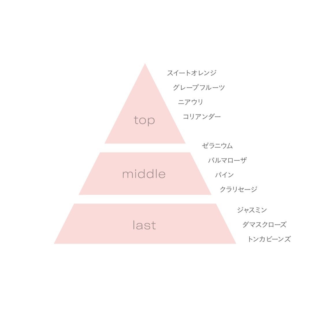 10種の精油と植物エキスなどをブレンドし、桜を表現した自然由来成分100%※3の香り。桜餅を思わせるパウダリーなジプテリクスオドラタ種子エキス(トンカビーンズ)をアクセントに、ダマスクバラ花油やゼラニウムなどをブレンドした香りは、透明感のあるやわらかな甘さの中にグリーン調の爽やかさがほのかに漂います。儚くも凛とした美しさで春を彩る桜をイメージした香りに包まれて、心はまるで空に溶けていくように。