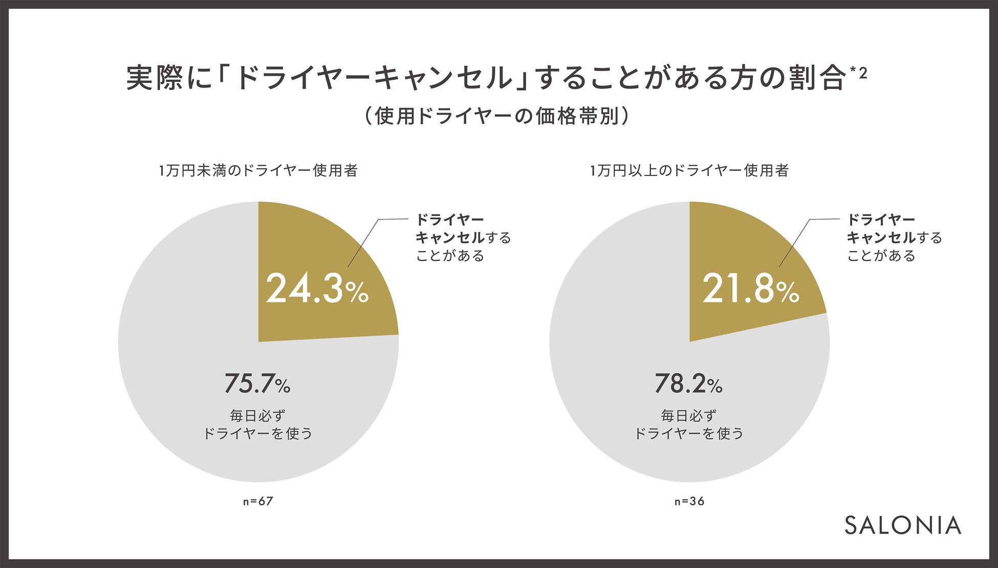 使用ドライヤーの価格帯別(1万円未満と1万円以上)におけるドライヤーキャンセルをする方の割合*2は、いずれも約2割程度であることがわかりました。このことから、1万円以上の高機能なドライヤーを使用していても、ドライヤーを手間に思う気持ちは変わらないと考えられます。