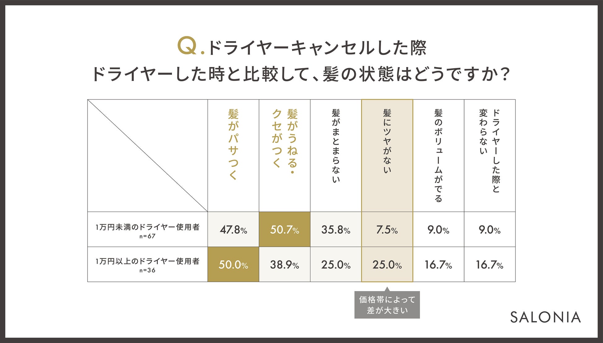設問「ドライヤーキャンセルした際、ドライヤーした時と比較して髪の状態はどうですか」に対し、使用ドライヤーの価格帯別に回答をみると、1万円未満は上位順に「髪がうねる・クセがつく」「髪がパサつく」「髪がまとまらない」、1万円以上は上位順に「髪がパサつく」「髪がうねる・クセがつく」、「髪がまとまらない」と「髪にツヤがない」が同位となりました。両者において最も差が大きい項目は「髪にツヤがない」で、その差は17.5ポイントにのぼりました。このことから、高価格ドライヤーの使用により「髪のツヤ」への効果を実感する傾向にあると考えられます。