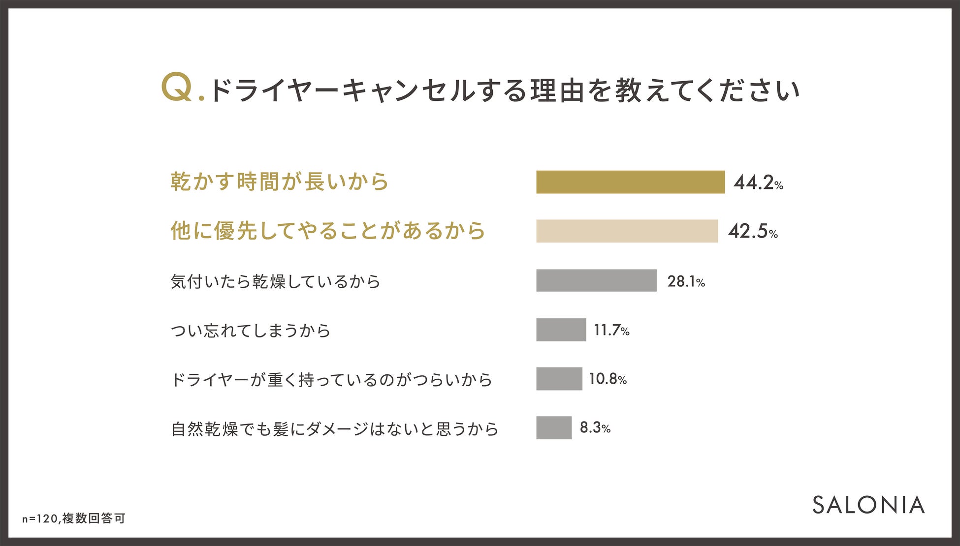 設問「ドライヤーキャンセルする理由を教えてください」に対して、上位の回答として「乾燥時間が長いから」44.2%と「他に優先してやることがあるから」42.5%があがりました。設問「普段、ドライヤーで髪を乾かす時間を教えてください」に対し、「5分未満」と「5~10分未満」のいずれかを回答した割合が65.3%であったことから、10分未満でもドライヤーに費やす時間としては長く感じる傾向にあるようです。