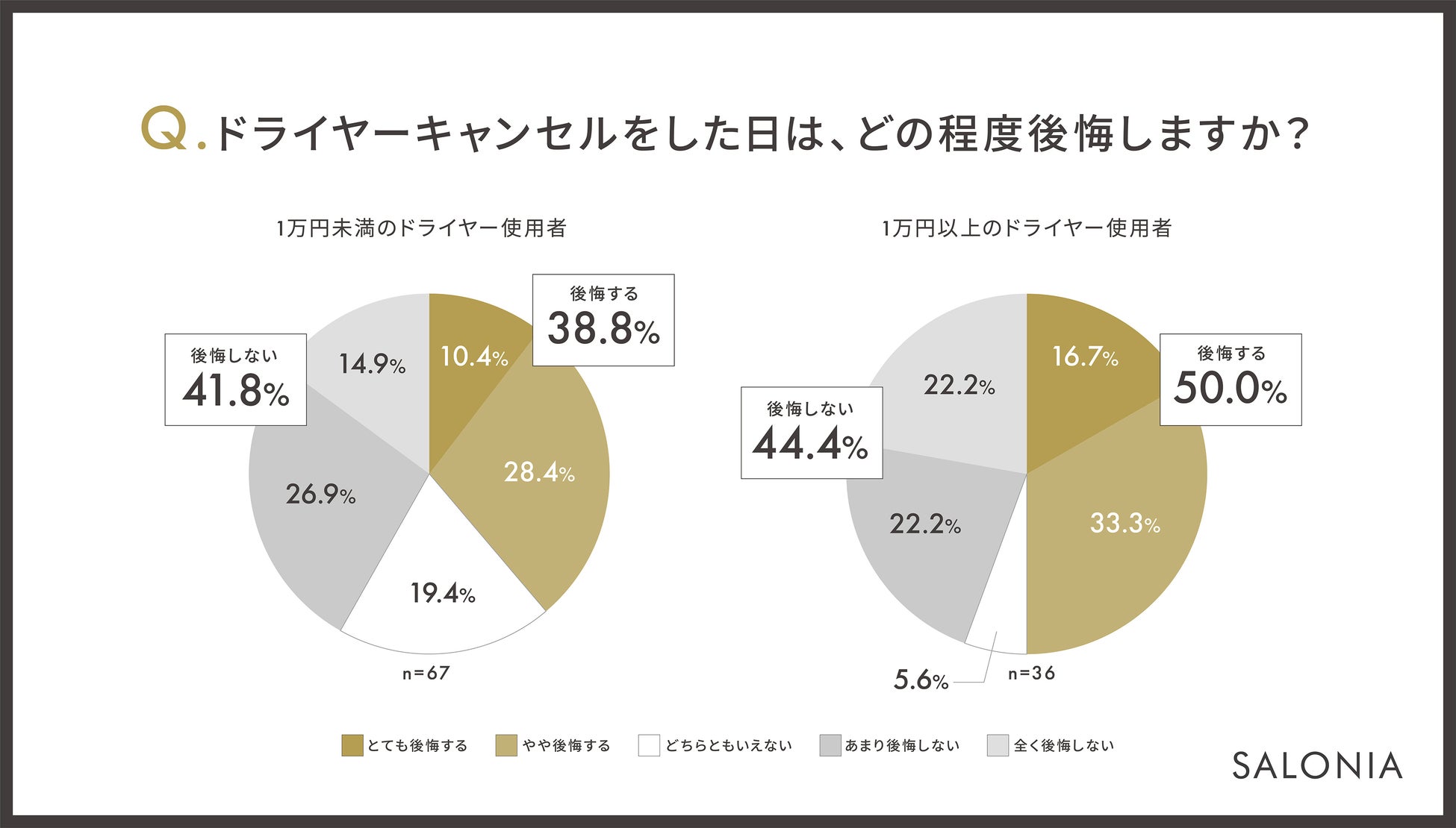 一方で、設問「ドライヤーキャンセルした際、どの程度後悔しますか」に対し、使用ドライヤーの価格帯別に「後悔する」の回答率をみると、1万円未満が38.8%、1万円以上が50.0%であることがわかりました。このことから、高価格ドライヤーの使用者の方がドライヤーキャンセルに対する後悔の気持ちが生まれる傾向にあり、ヘアケアの意識の高さが伺えます。