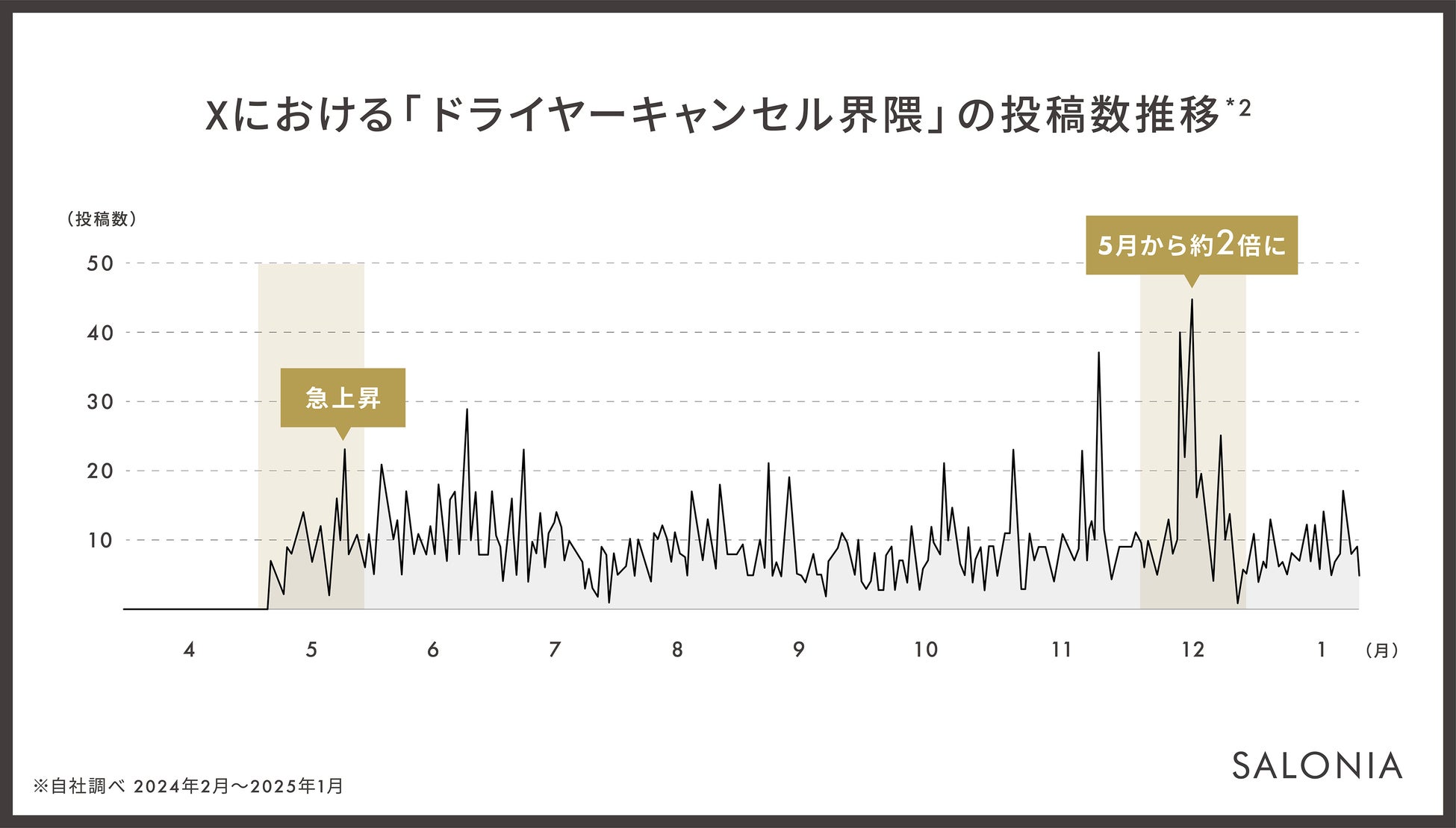 SNSのXにおいて2024年4月頃に「風呂キャンセル界隈」が大きな話題を呼びトレンドとなりましたが、同時期に、入浴後のドライヤーが面倒で髪を自然乾燥で済ませる現象を指す「ドライヤーキャンセル*1界隈」が派生しました。Xにおける投稿数を調査したところ、2024年5月頃から急上昇し、12月頃には約2倍近く増加していました。*2その状況を受けて、ドライヤーシリーズの累計販売台数450万台*3を突破したSALONIAでは、ドライヤーの使用に関する実態調査を実施しました。