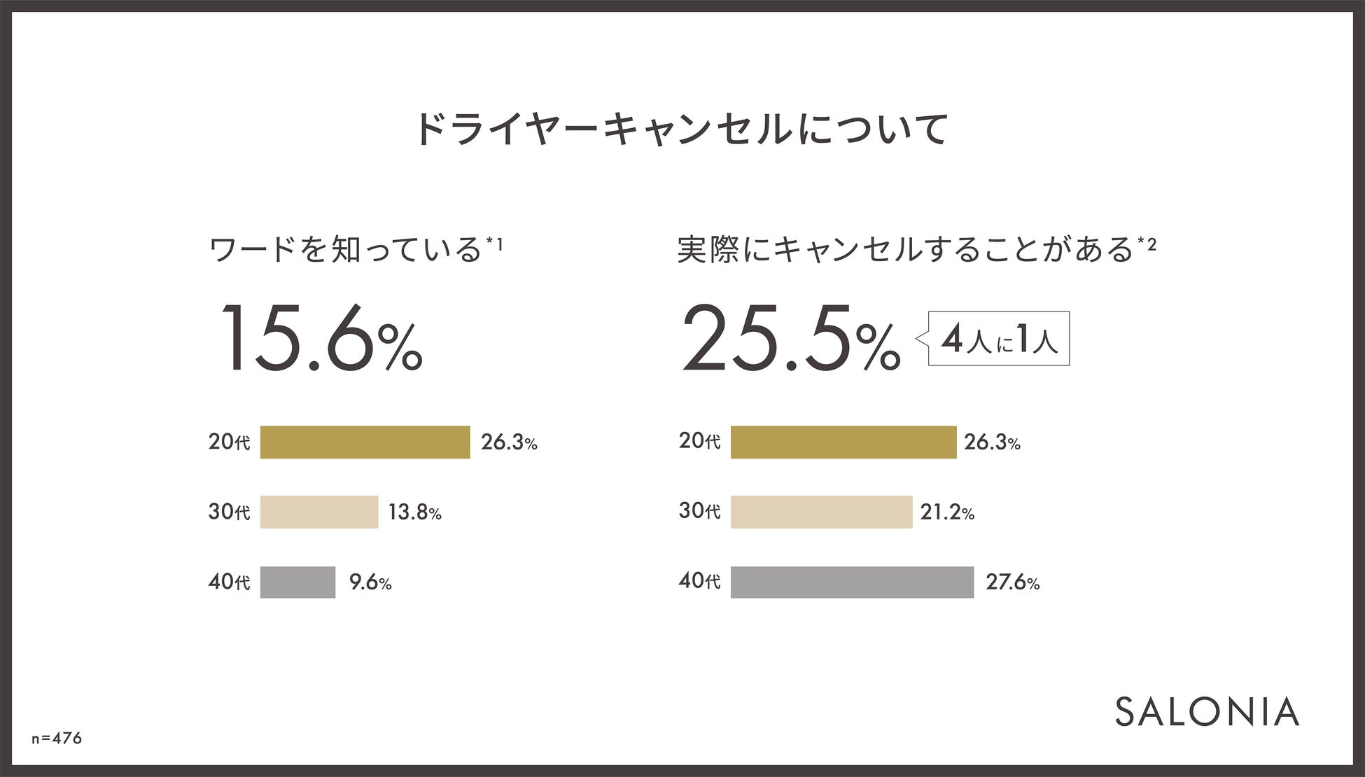 さらに、実際に「ドライヤーキャンセル」をしている方の割合*2は25.5%でした。さらに、年代別にみると20代は26.3%、ワードの認知率が低い40代は27.6%と同程度であることから、「ドライヤーキャンセル」という言葉は知らずとも、年代を問わずあてはまる日常的な行動であると考えられます。