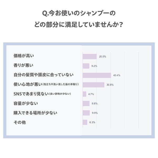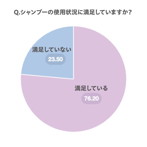 近年、品質の良い商品が増え、ヘアケア市場は拡大傾向にあります。アンケート調査(自社調べ*3)によると、シャンプーの使用状況に関して「満足している」と答えた割合は76.2%、「満足していない」と答えた割合は23.5%でした。また、満足していないと答えた一番の理由が「自分の髪質・頭皮に合っていない」となっています。